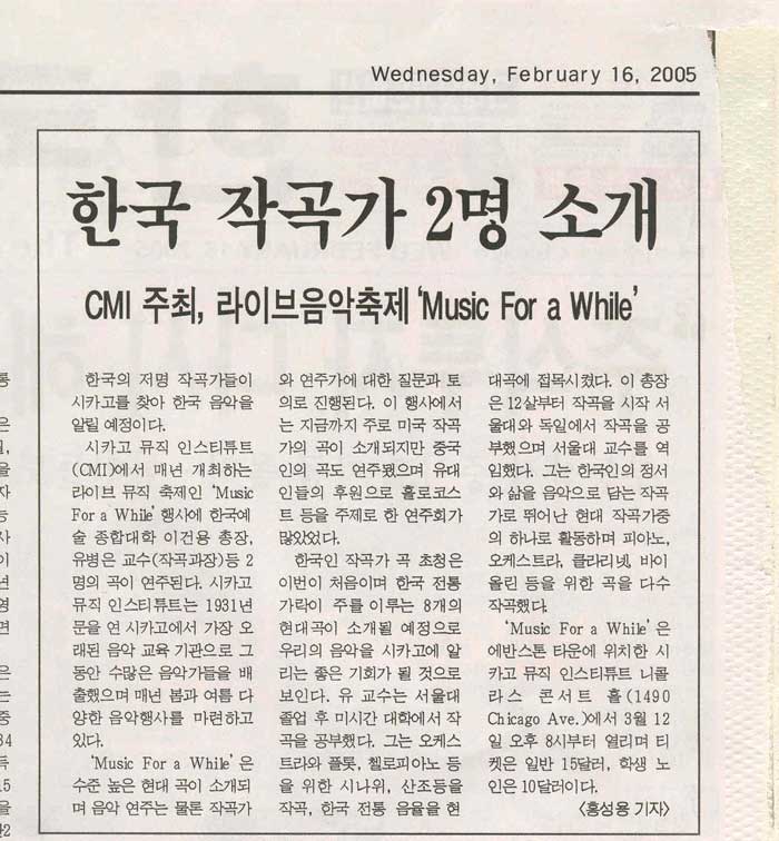 Music Institute of Chicago Presents Korean Composers Works MUSIC FOR A WHILE